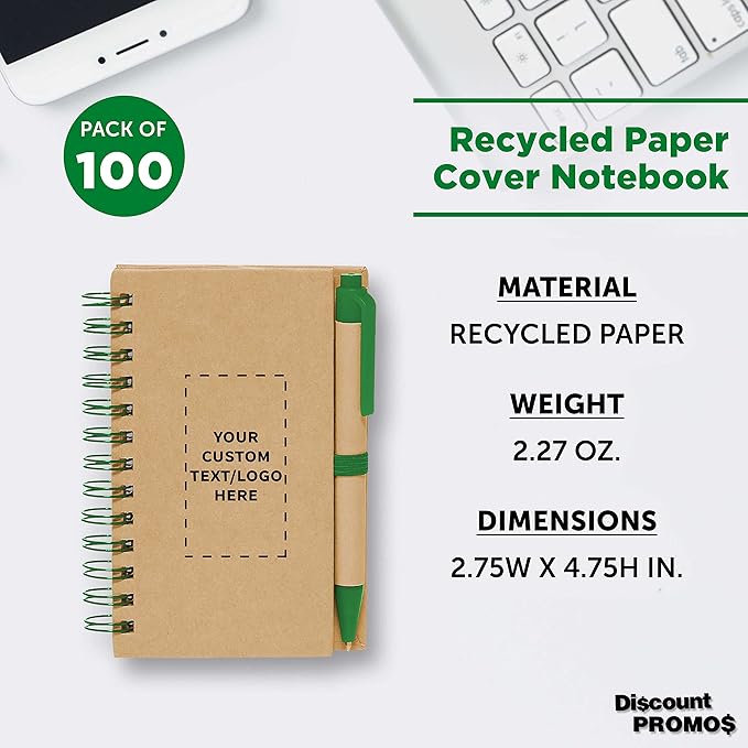 Custom Mini Spiral Notebooks with Black Ink Pens Set of 100, Personalized Bulk Pack - Perfect for School, Office, Business, Home - Green
