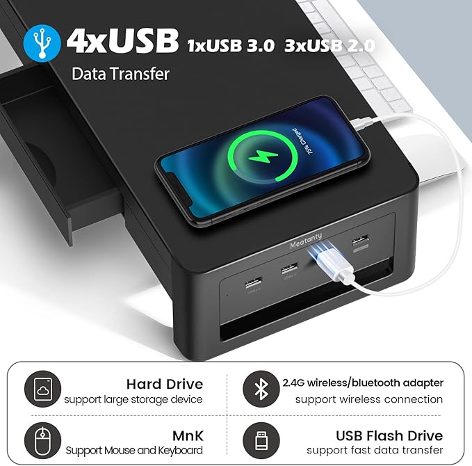 - 【Hub Expansion with 4 USB Ports】Meatanty dual computer monitor stand supports data transfer and hub function, which makes it easy to connect your USB devices such as smartphones, USB sticks, iPads, Kindles and other devices.