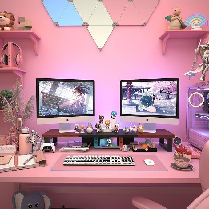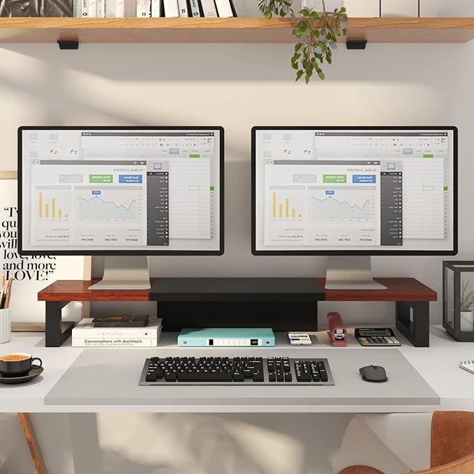 - 【Monitor Stand for 2 Monitors】This stand is an ideal choice when you need computers to work together. Unique original design,patented products,this dual-monitor stand features a sturdy construction black with a rustic brown wood finish for an added rustic and unique look.