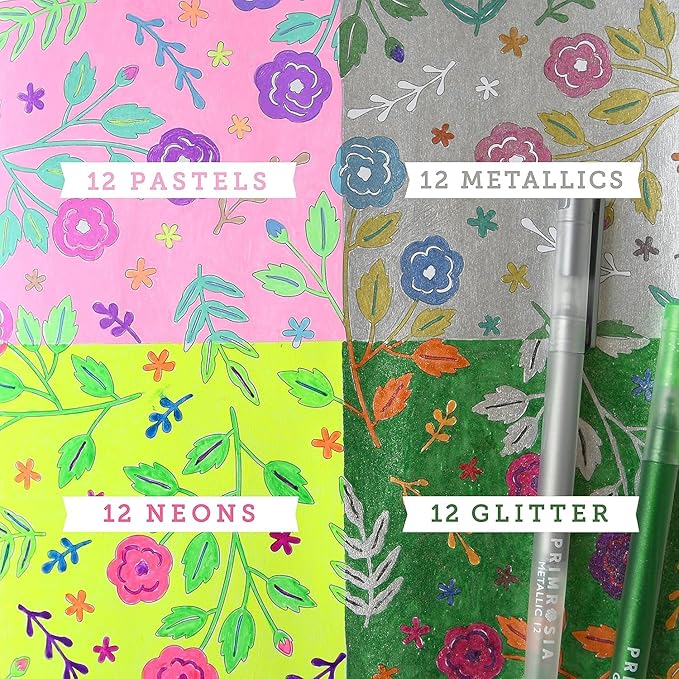 Primrosia 48 Glitter Gel Pens, inc. Metallic, Pastel & Flourescent for Adult Coloring Book & Bullet Journal Pens. No-Bleed-Through in a Variety of Shades, 7.5x More Ink Fine Point Markers Set