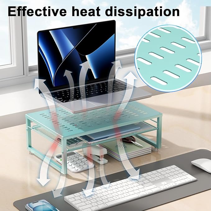 - 【Practical and Stylish】 The laptop stand has a simple yet sophisticated dual-layer design, providing ample space to store various office supplies, keeping your desk tidy. This allows you to work more efficiently in a comfortable and organized environment.