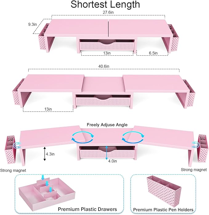 - 【Ample Storage Space】The dual monitor stand features two magnetic pen holders and a drawer, allowing you to easily organize your desk accessories and office supplies, keeping your workspace clear and tidy for easier access.