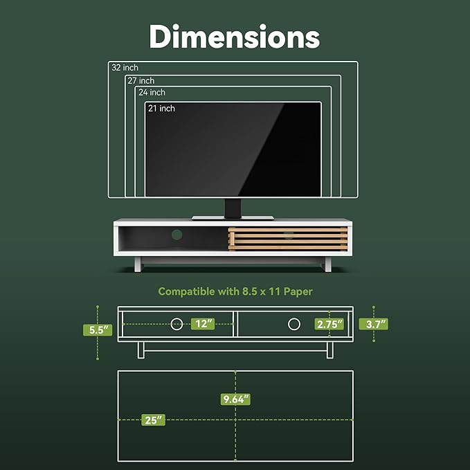 Monitor Stand Riser with Sliding Door, Computer Laptop Stand Desk Shelf Organizer with Storage (White + Natural Bamboo, 25 Inch)