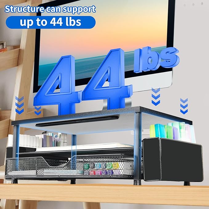 - Space-saving Solution: This dual-tier desk shelf computer stand with a drawer and 2 pen holders provides ample storage for your office supplies and office desk accessories. Enjoy a tidy workspace that enhances your daily mood