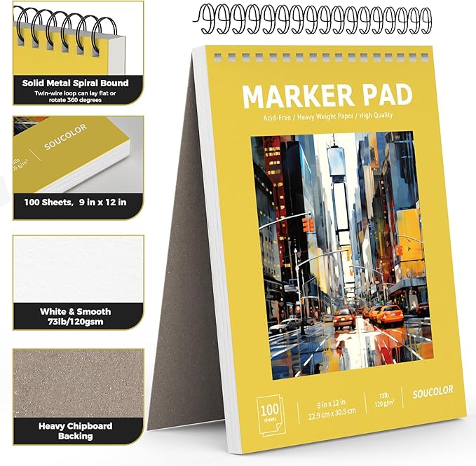 Soucolor 100 Sheets Marker Paper Pad, 9"x12" Bleedproof Art Sketch Pad, 73lb/120gsm Drawing Paper Spiral Sketch Book, Alcohol Marker Paper Painting Coloring Paper for Beginners, Artists, Kids