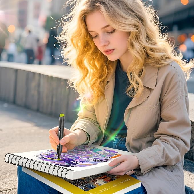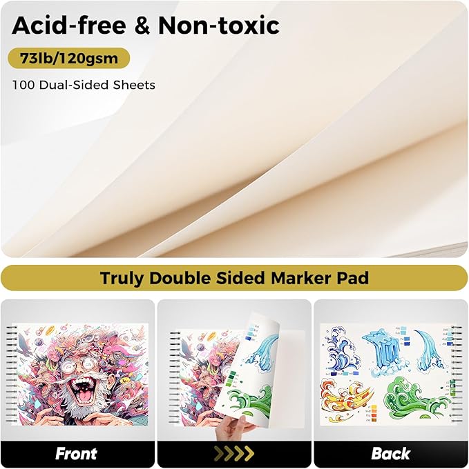 - Premium 120LB (200GSM) Marker Paper & Sketch Pad - Our professional-grade bleedproof sketchbook features a sturdy, sustainable white surface that handles alcohol markers, acrylic paint, and all artistic techniques without bleeding. The smooth texture works perfectly with sketching, coloring, and blending, while the double-sided design provides 200 usable pages (100 sheets) for extended creativity.