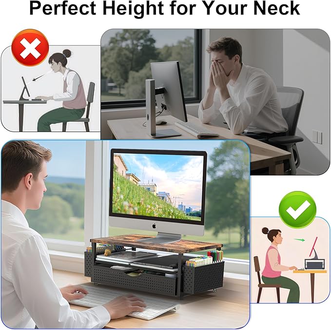 - Ergonomic design: Raise the monitor to eye level for the most comfortable viewing experience, relieve your neck, back, waist, help you develop a good posture and provide a neat workspace.experience.